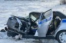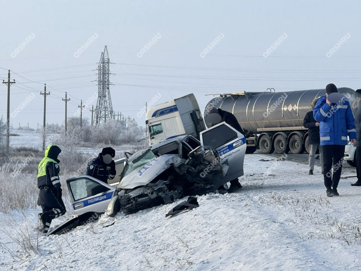 В ДТП с большегрузом патрульная машина ДПС превратилась в груду металла. В аварии серьезно пострадали сотрудники полиции. Их госпитализировали. На месте работают спецслужбы.